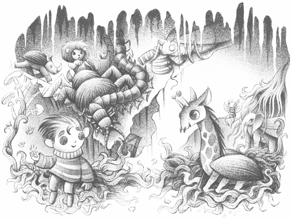 В пещеру вошёл Жукорог. С острым костяным рогом, маленькими круглыми глазками, растопыренными ушами и жёсткой верёвкой хвоста, он напоминал обычного носорога. Но его крепкие ноги-бочонки держали на себе чёрный, как у жука, хитиновый панцирь, из-под которого выглядывали тонкие прозрачные крылья.