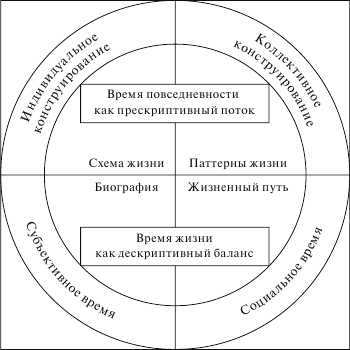 На рис. 1 отражено различное позиционирование биографии и жизненного пути как описательного баланса времени жизни, а также схем и паттернов жизни как задумываемого проекта повседневного времени. И хотя теоретическая схема проводит четкую границу между субъективным временем биографии и социальным временем, структурирующим жизненный путь, темпоральный аспект биографии делает эту границу лабильной.