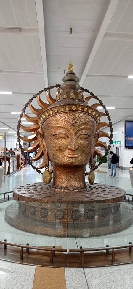 Passage inside exclusively barefoot on hot stone steps. Inside the statue there is a museum-cave dedicated to the Indian epic.