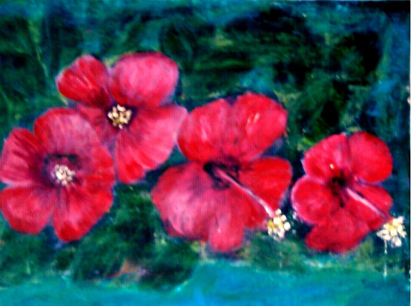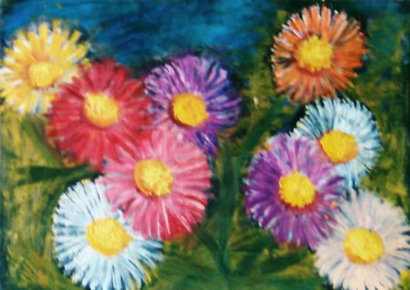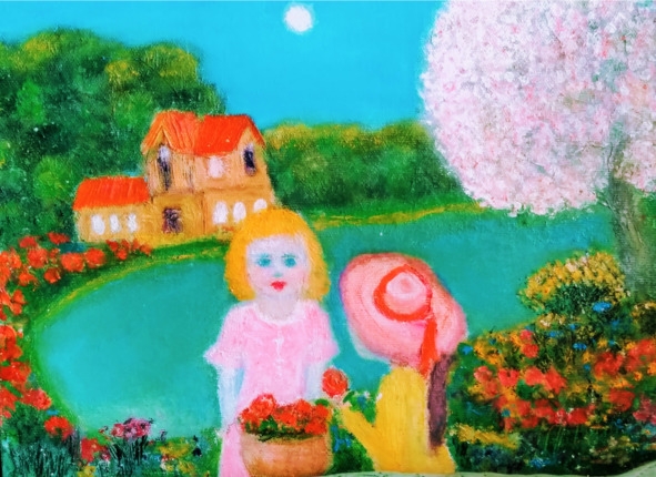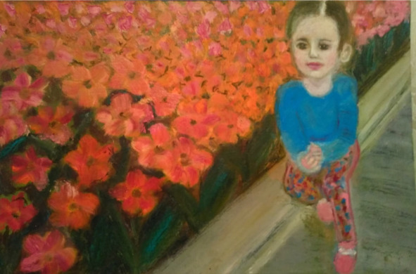 Внучка Лиза у клумбы тюльпанов. Холст автора, масло.