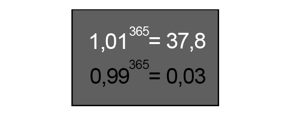 Принимая свои усилия за единицу (1) и возведя её в степень количества дней в году (365), мы получаем весьма интересный результат. Делая чуть-чуть меньше, чем мы можем, получаем практически нулевой результат. Но стоит нам приложить сверхусилие и начать делать чуть больше своих возможностей, мы получаем увеличенный многократно результат. И это не философия или теория, это простая математика, проверенная опытом жизни. Запомните эту формулу, она отлично отображает результат, полученный от сделанного нами сверхусилия.