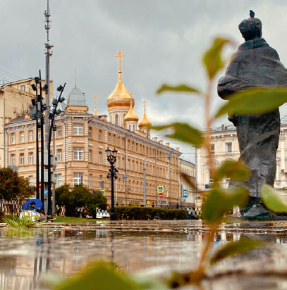 Вид со Сретенского бульвара на памятник Н. К. Крупской и Воскресенский храм на Рождественском бульваре