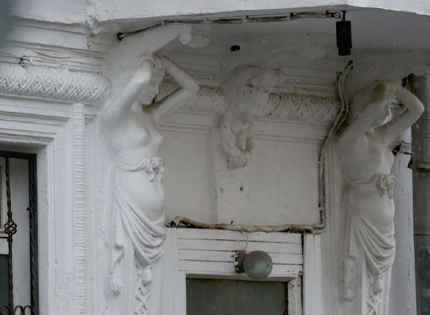 Начнем с Большого Головина переулка и дома с беременными кариатидами. Почему они такие? Может быть, потому, что дом этот был публичным, увеселительным заведением? Но при чем тут беременные красотки на фасаде? Есть две версии.