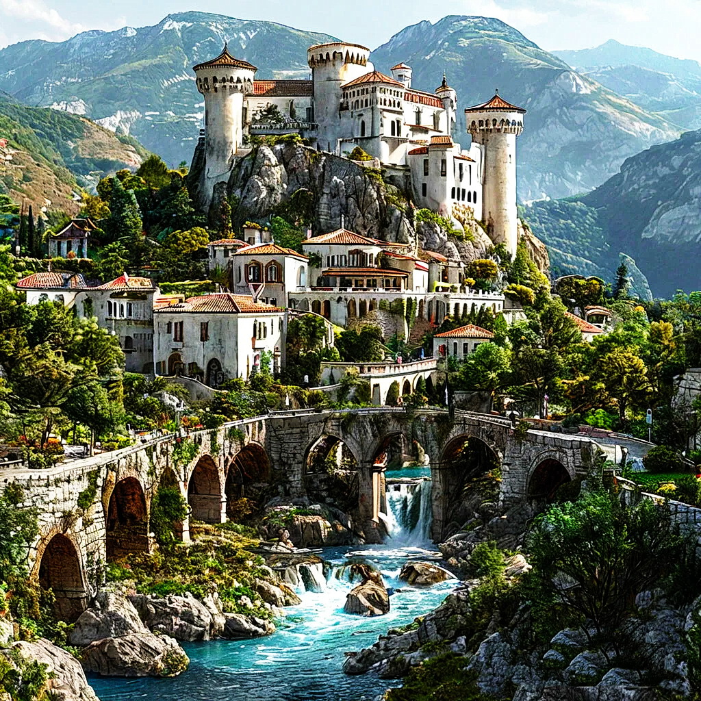 Он продолжил: «Слева от крепостной стены, ограждающей жилые постройки, протянулась извилистая бурливая речка. Она брала начало где-то в горах, пробегала весело пороги и раскинувшись вволю в долине у подножия замковой горы, спокойно текла себе дальше, снабжая водою окрестные селения. В нескольких местах её пересекали надёжные и причудливо украшенные каменные мосты. Глядя на это в целом, хотелось оформить вид в раму и повесить живописное полотно у себя над камином».