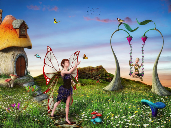 Лесная Фея пошла по лесной тропинке, но внезапно она споткнулась и упала. И перед ее глазами она увидела большую яму, скрытую травой. Это был вход в пещеру. Нашу Фею просто потянула туда. Она провалилась в пещеру и через какое- то время вышла на просторную поляну. Там стоял огромный красивый дом, а вокруг было много людей. Все они были заняты и трудились не покладая рук. И каким-то чутьем Лесная Фея поняла, что это ее предки, все они были для родными и ей захотелось всех обнять.