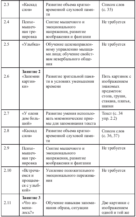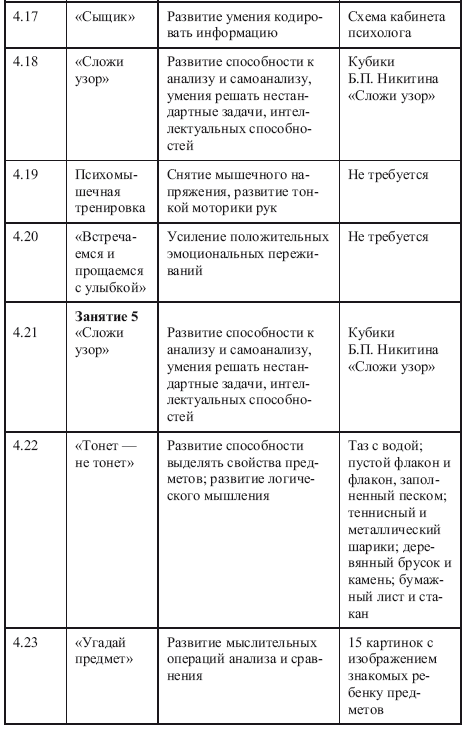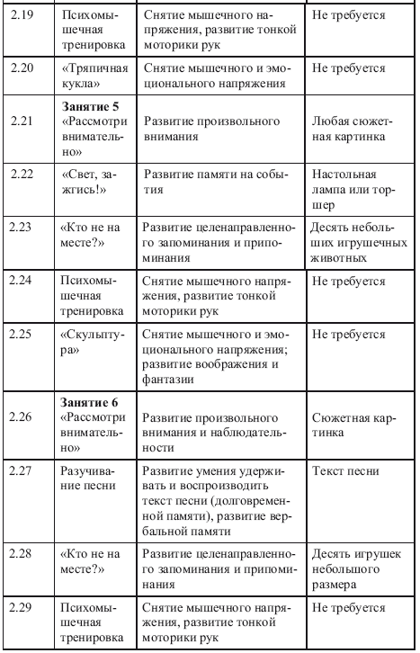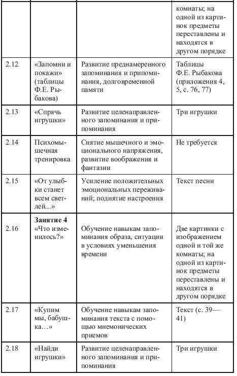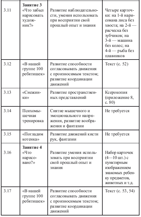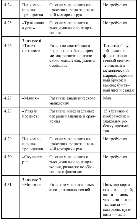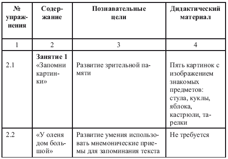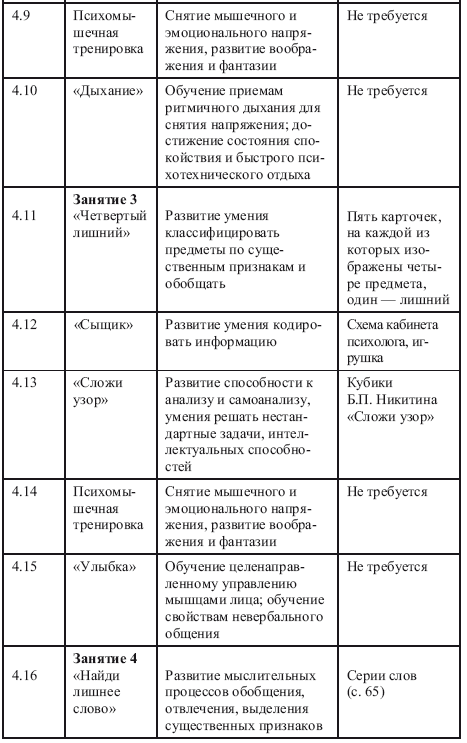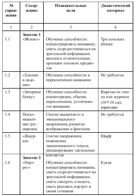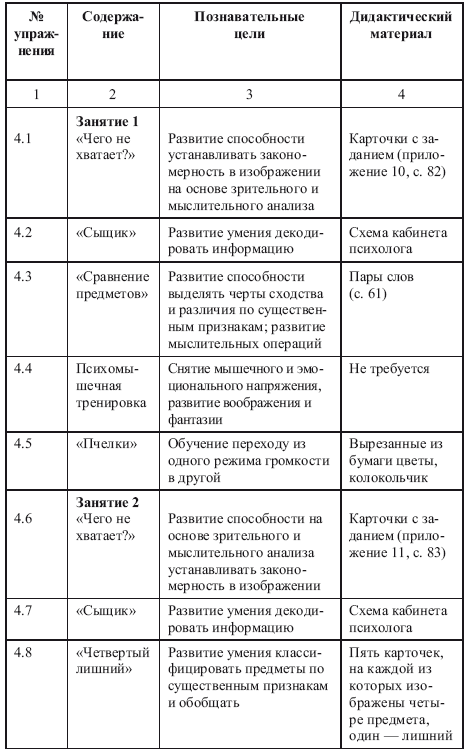 Предложенный комплекс занятий направлен на развитие четырех взаимосвязанных психических процессов, определяющих познавательные возможности, и включает соответствующие разделы: «Внимание», «Память», «Восприятие», «Мышление». Каждый раздел рассчитан на семь недель, цикл занятий по программе рассчитан на 28 недель (по одному занятию в неделю). В конце каждого раздела программы даны рекомендации педагогам и родителям для индивидуальной работы с детьми по развитию их познавательных возможностей.