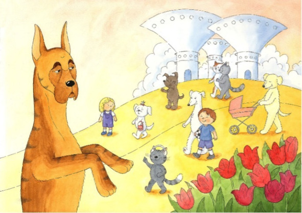 Открыв глаза, все четверо увидели очень светлый, нарядный город, где, пожалуй, было больше собак и кошек, чем людей. Тут же к ним подбежал огромный шикарный дог тигровой масти и произнес человеческим голосом (но акцент собачий присутствовал):