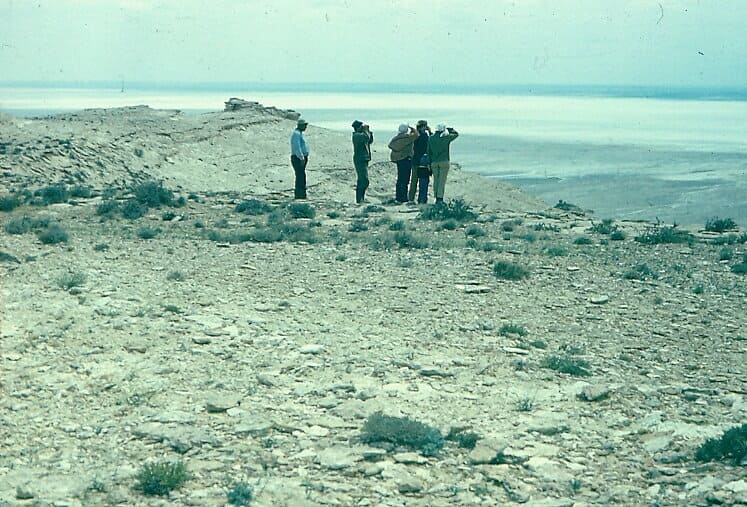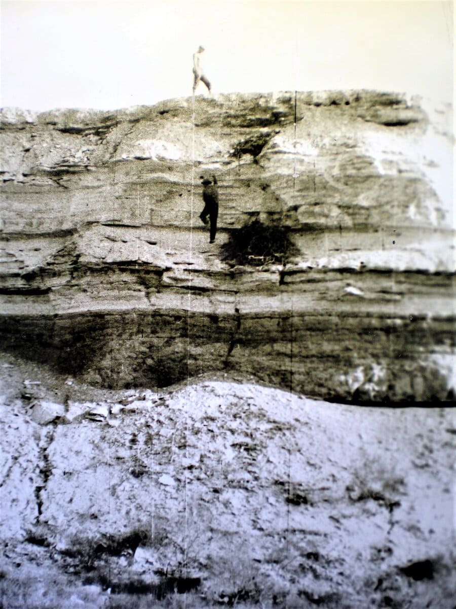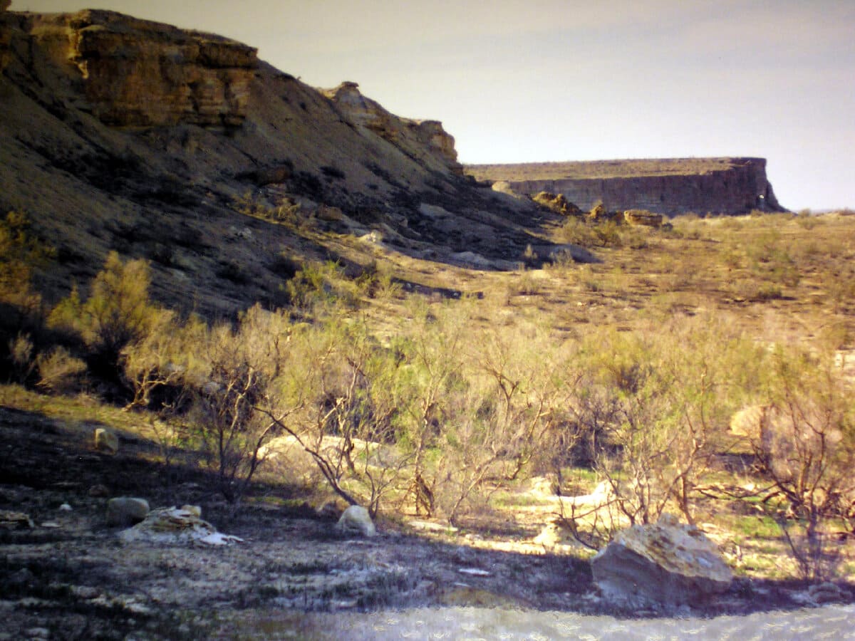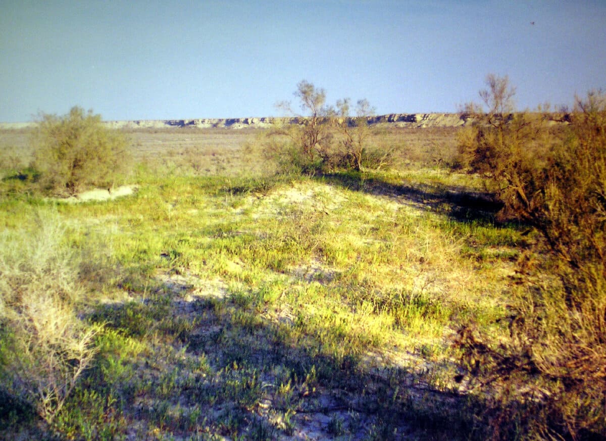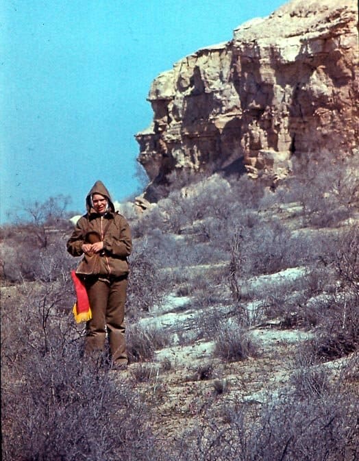 Автор на фоне чинка (обрыва), сверху находится плакор (плоская равнина), снизу обычны пески, заросшие саксаулом и другими кустарниками. Я действительно таскала вымпел на поясе. Это не шутка. Март, 1982