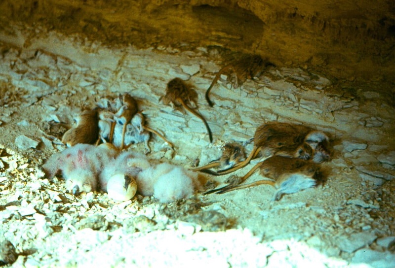Гнездо филина в процессе вылупления птенцов. Рядом запасы еды из песчанок и тушканчиков для голодных детей