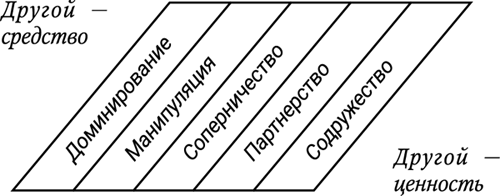 Два полюса на шкале Е. Л. Доценко обозначают так же, как полюса объектного и субъектного отношения к человеку. На самом же деле речь идет скорее о равноправии интересов. Интересы другого сначала игнорируются (доминирование и манипуляция), затем учитываются в той мере, в какой это диктуется задачами борьбы (соперничество), затем согласовываются (партнерство), а затем – происходит стремление к объединению (здесь авторский текст лаконичен, и из него не вполне ясно, что происходит с интересами).