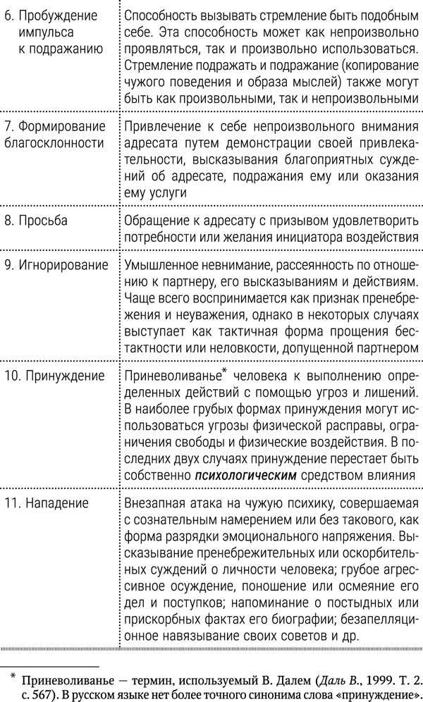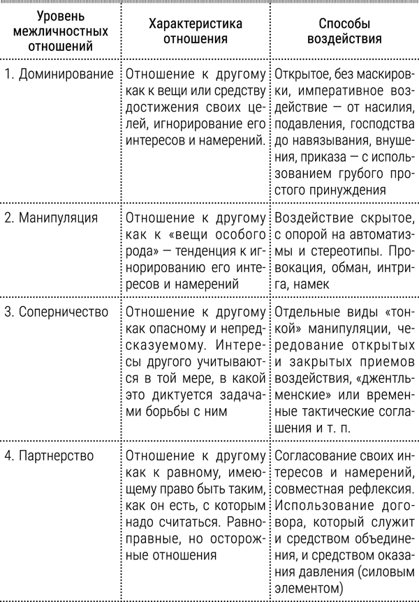 В классификации психологического влияния на варварское, манипулятивное и цивилизованное есть единая ось – ось цивилизованности. Сопоставим ее с классификацией уровней межличностных отношений, предложенной Е. Л. Доценко, опиравшегося на типологии В. Н. Сагатовского и Г. А. Ковалева (Доценко Е. Л., 1996; Сагатовский В. Н., 1980; Ковалев Г. А., 1987; 1989).