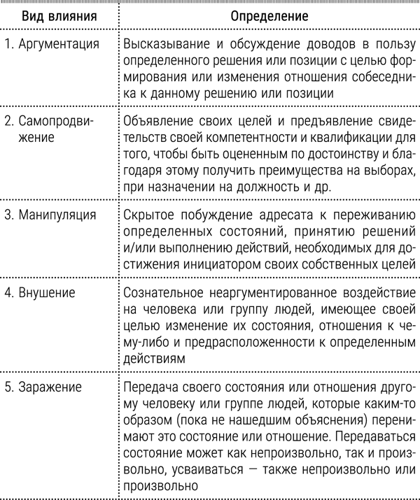 По-видимому, проблема влияния из морально-этической плоскости рассмотрения должна быть переведена в психологическую. С психологической же точки зрения будет правомерно говорить не о том, кто имеет право влиять, а кто – нет (все имеют право), а о том, насколько цивилизованны те или иные способы взаимного влияния, то есть о том, насколько они полезны и созидательны для его участников.