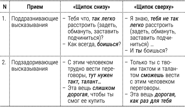 Манипулятор может применять и универсальные щипки, которые парадоксальным образом действуют одновременно и сверху, и снизу, заставляя струну дрожать, трепетать, вибрировать. При этом важно, что человек не понимает, то ли ему польстили, то ли упрекнули в чем-то.