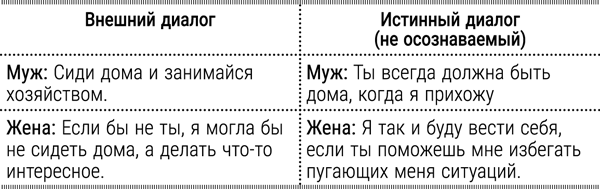 Однако вопреки ее жалобам выяснилось, что на самом деле муж оказывал ей большую услугу, запрещая делать то, чего она сама очень боялась. Более того, он фактически даже не давал ей возможности догадаться о своем страхе. Как только он позволил ей начать ходить в танцевальную студию, она с изумлением обнаружила, что вовсе не хочет танцевать и находиться в таком скоплении людей. Ей было страшно на людях, а муж своими запретами давал ей право избегать таких страшных для нее ситуаций.