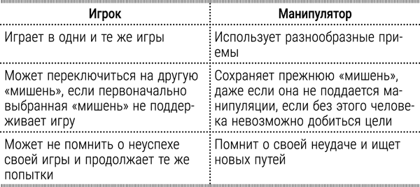 В тренинге участники часто задают вопрос: «Как отличить того, кто «честно», то есть бессознательно, играет в психологическую игру, от манипулятора?» Можно предложить следующий критерий: манипулятор может отказаться от манипуляции и перейти к цивилизованному взаимодействию, а игрок не может. Иные игроки, многократно столкнувшись с тем, что другой человек не поддерживает игру, переключится на другую мишень. Иные же игроки будут продолжать затевать игру, как будто забывая о том, что данный человек ее никогда не поддерживает. Такие игроки будут вновь и вновь задавать одни и те же вопросы, обращаться с одними и теми же репликами, использовать одни и те же гримасы и жесты, как будто они взаимодействуют с этим человеком впервые.