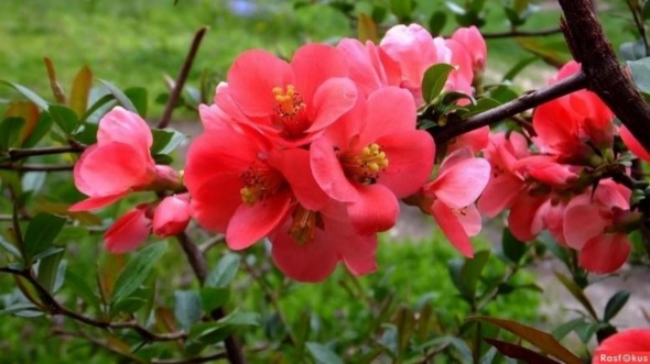Айву любят садоводы по двум причинам: в середине осени созревают плоды, имеющие целый комплекс витаминов и обладающие оригинальным сочетанием вкуса и запаха, а также за обильное и роскошное цветение. Я посадила ее на переднем плане сада именно для красоты.