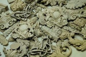 Точно также можно затонировать поталь, добавить сложности и глубины. Наносим поталь, защищаем ее шеллаком. Сушим. Затем кисточкой наносим битум и аккуратно снимаем излишки мягкой тканью. Битум остается в глубине рельефа, подчеркивая красоту выступающих частей.