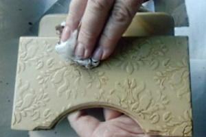 Разбавленный битумный лак (Уайт спиритом) наносим на поверхность и сразу вытираем излишки. Материал, который останется в глубине, подчеркивает рельеф.