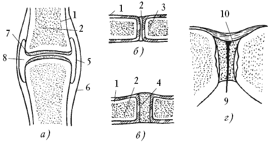 Рис. 1. Виды соединения костей (схема): а – сустав; б – фиброзное соединение; в – синхондроз (хрящевое соединение); г – симфиз (полу-сустав); 1 – надкостница; 2 – кость; 3 – волокнистая соединительная ткань; 4 – хрящ; 5 – синовиальная мембрана; 6 – фиброзная мембрана; 7 – суставной хрящ; 8 – суставная полость; 9 – щель в межлобковом диске; 10 – межлобковый диск