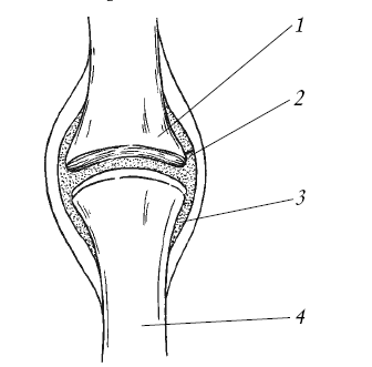 Рис. 2. Строение сустава: 1 – кости, образующие сустав; 2 – суставная капсула; 3 – суставная полость, заполненная суставной жидкостью; 4 – суставные поверхности