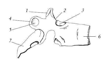 Рис. 7. Грудной позвонок (вид сбоку): 1 – верхний суставной отросток; 2 – суставная поверхность для сочленения с ребром; 3 – поперечный отросток; 4 – реберная ямка; 5 – тело позвонка; 6 – остистый отросток; 7 – нижний суставной отросток