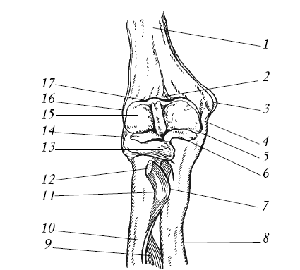 Рис. 12. Локтевой сустав: 1 – плечевая кость; 2 – венечная ямка; 3 – медиальный надмыщелок; 4, 13, 14 – связки; 5 – блок плечевой кости; 6 – венечный отросток; 7 – бугристость локтевой кости; 8 – локтевая кость; 9 – межкостная мембрана предплечья; 10 – лучевая кость; 11 – бугристость лучевой кости; 12 – сухожилие двуглавой мышцы плеча; 15 – головка плечевой кости; 16 – латеральный надмыщелок; 17 – лучевая ямка