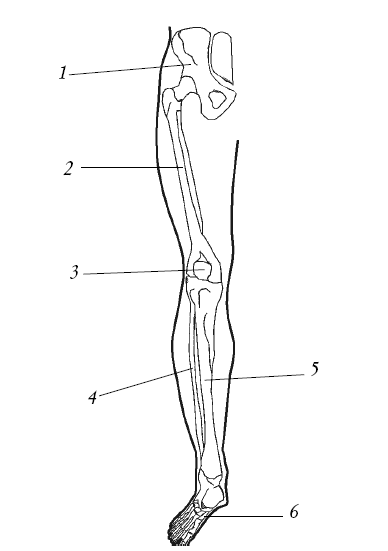 Рис. 13. Скелет нижней конечности: 1 – тазовая кость; 2 – бедренная кость; 3 – надколенник; 4 – малоберцовая кость; 5 – большеберцовая кость; 6 – кости стопы