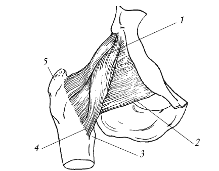 Рис. 14. Тазобедренный сустав и укрепляющие его связки: 1 – подвздошно-бедренная связка; 2 – лобково-бедренная связка; 3 – малый вертел; 4 – межвертельная линия; 5 – большой вертел