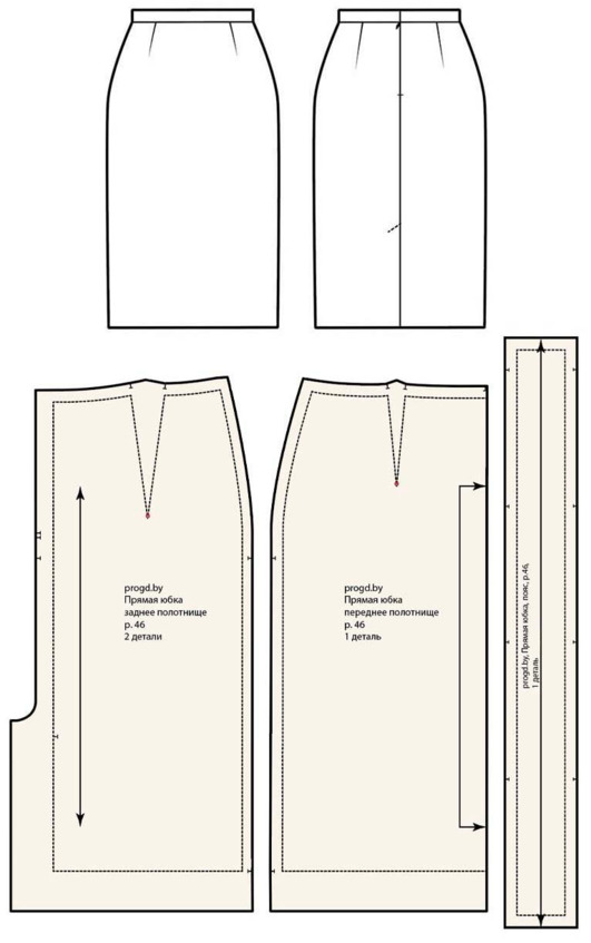 Рис.1. Технический рисунок и выкройка прямой юбки со шлицей