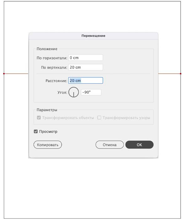 3) В диалоговом окне «Перемещение» введите следующие параметры: По горизонтали – 0 см; По вертикали – 20 см. Кликните на кнопку «ОК» (рис. 7).