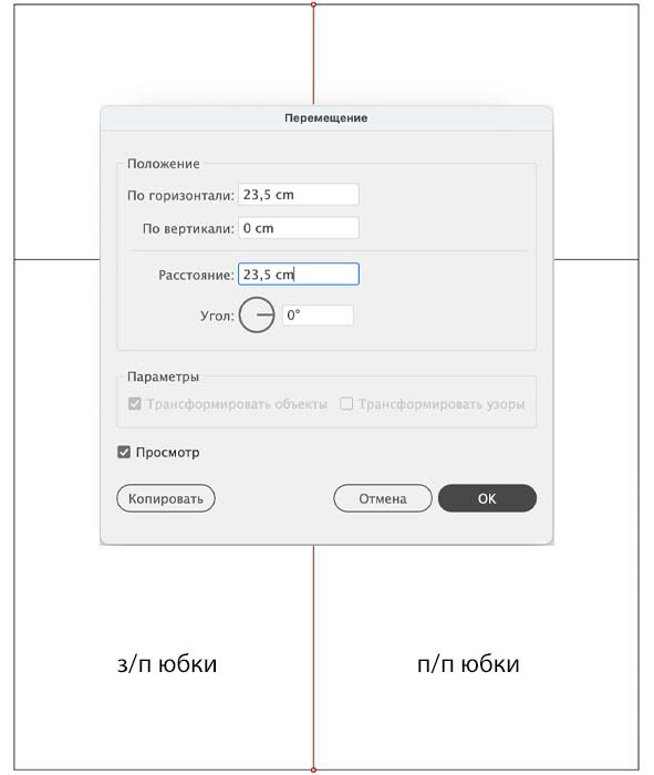 3) В диалоговом окне «Перемещение» введите следующие параметры: По горизонтали – 23,5 см; По вертикали – 0 см. Кликните на кнопку «ОК» (рис. 9).