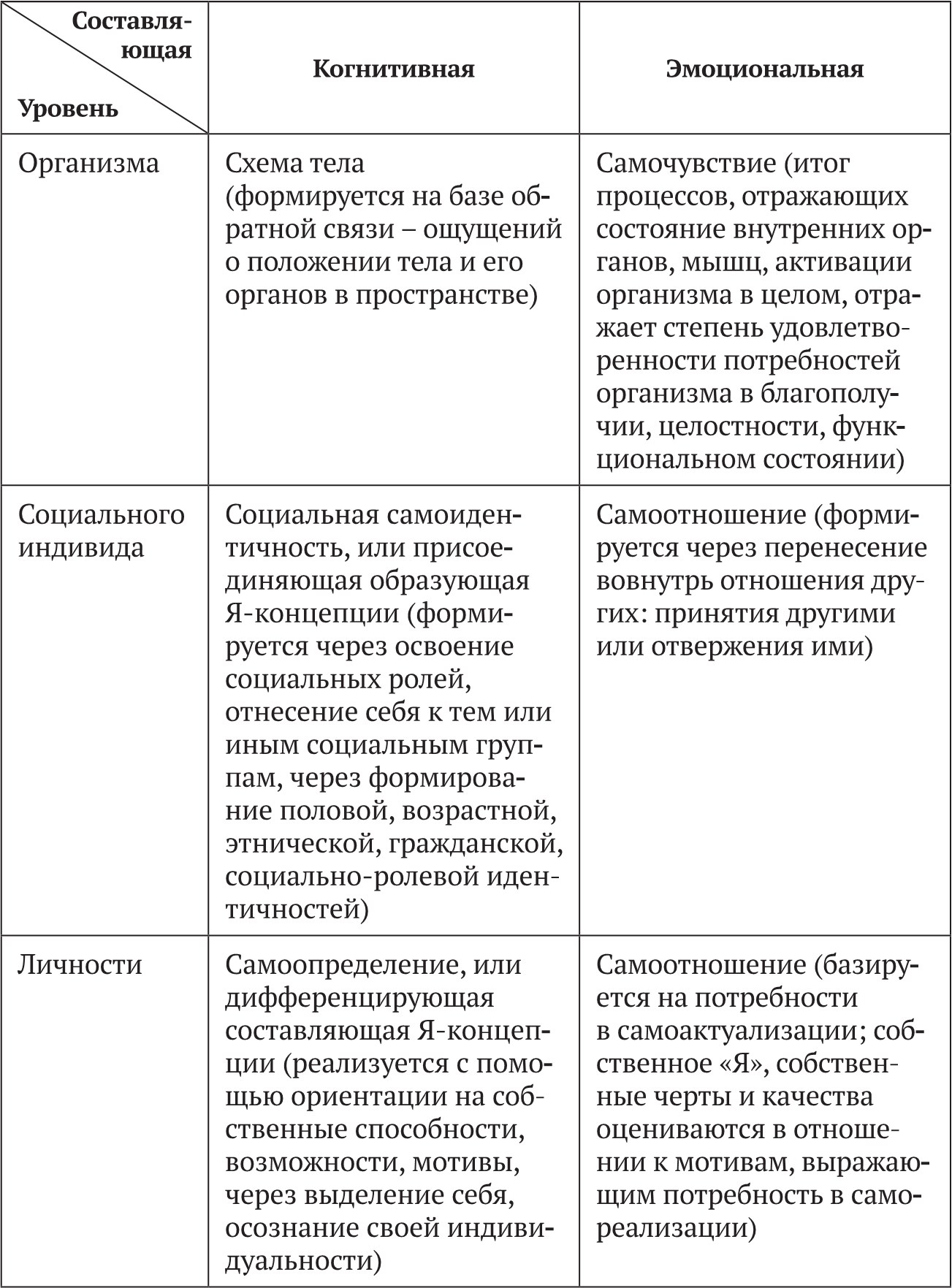 Таким образом, В.В. Столин выделяет три уровня, на первом из которых находятся функции, играющие важную роль «обратной связи» в формах активности организма. В данном случае речь идет о процессах «самовыделения и принятия себя в расчет» в перцептивных и двигательных актах. Следующий уровень представляет собой совокупность процессов, связанных с принятием точки зрения другого на себя, идентификацией с родителями, усвоением стандартов выполнения действий и формированием самооценки, самопонимания, формированием самоидентичности в рамках семейных отношений и отношений со сверстниками, формированием половой и профессиональной идентичности, становлением самоконтроля. Данный уровень именуется самосознанием индивида. Наконец, высшим уровнем развития самосознания автор называет выявление социальной ценности и смысла бытия, формирование и изменение представлений о будущем, прошлом и настоящем. Именно на этом уровне может идти речь о самосознании личности [179, с. 100–103].
