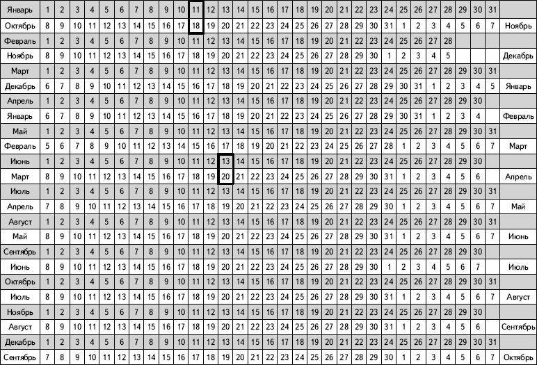 Можно также воспользоваться специальной таблицей определения дня родов по дате последней менструации. Про сто найдите дату первого дня последних месячных в строке серого цвета, и дата, расположенная под найденной, будет соответствовать предполагаемому дню родов.