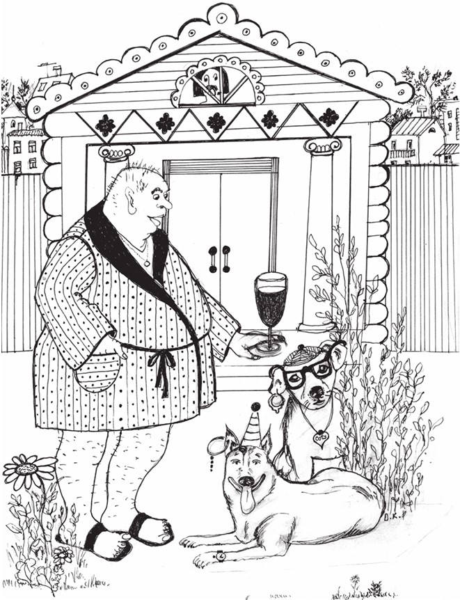 Как-то раз теплым летним днем нанятая им садовница Таня, копаясь на газоне, подняла глаза, чтобы поздороваться. Барин стоял с чищеной рыбой из когда-то модного магазина «Метро». Он был в махровом халате и тапочках, вокруг вертелись две его собаки, которых он в честь каких-то неведомых сибирских рек назвал странными кличками: Манга и Бюлюм.