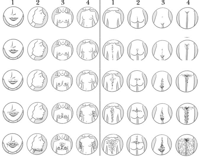 Для оценки состояния используют шкалу Ферримана – Гальвея. Измеряют степень выраженности оволосения в 9 областях тела по 4-балльной шкале.