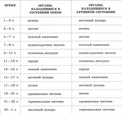 В китайской народной медицине существует понятие «часы работы энергетических меридианов». Если отследить время появления головной боли, можно узнать о пациенте много нового. Если боль возникает в одно и то же время, легче определить, какая именно причина ее вызывает. Существует 12 основных меридианов, по которым перетекает энергия. Но на этих путях могут возникать так называемые заторы. Эти места блокировки энергии создают проблемы со здоровьем и могут быть причиной болевых ощущений. На протяжении суток есть часовые отрезки, когда энергия тех или иных меридианов проходит интенсивно, а затем затухает. Ниже привожу таблицу работы энергетических меридианов.