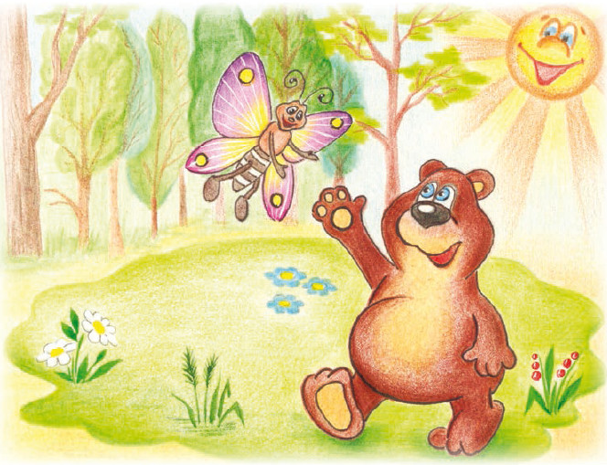Жил на свете маленький медвежонок. Грустно было ему в лесу Не было у него друзей. Но как-то раз увидел медвежонок возле своей берлоги красивую бабочку. Она весело кружилась над медвежонком и села ему на нос.