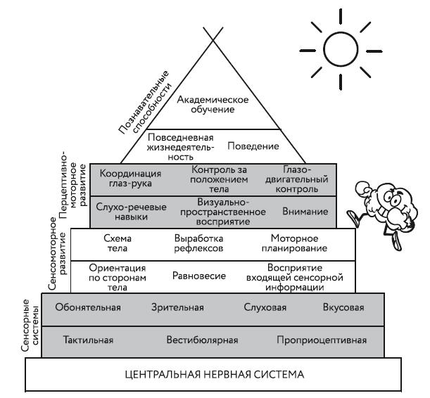 Советский психофизиолог Н. А. Бернштейн совершил прорыв в области физиологии активности человека. Он создал теорию уровней построения движений, согласно которой разные структуры центральной нервной системы отвечают за двигательную активность определённой сложности. Причём такие действия, как речь, чтение и письмо, формируются на базе более простых действий – ползание, ходьба, бег, прыжки, кидание мяча и т. д. На основе этой теории были разработаны тесты на выявление зрелости уровневой организации движений. Перед школой полезно проверить прежде всего способность бежать с фазой полёта (см. рис.), способность к прыжку, способность к броску.