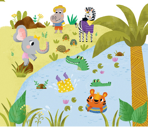 Черепашки забрались к зебре на спину, и она повезла их, как автобус или трамвай. Везла, везла, пока не довезла до самой речки.