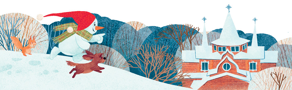 Оказалось, что Дедушка Мороз живёт в волшебном тереме. Снеговичок даже ахнул, когда увидел этот чудо-дворец. Тихо-тихо, робко-робко постучал он в дверь. Вдруг Дедушка Мороз его прогонит? Скажет: «Что это ещё за помощник такой выискался? Три снежка, одна морковка! Видали мы таких помощников!»