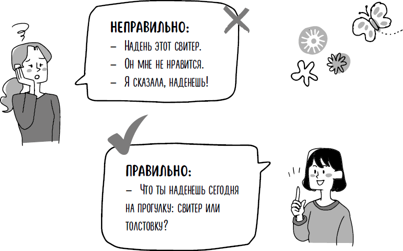 Почему бы не установить дружеские, доверительные отношения с вашим малышом – отношения сотрудничества? Почему бы не спросить, чего хочет сам ребенок? Каждый человек, даже маленький, – это личность. Все члены семьи достойны уважения. Все имеют права и обязанности. Каждый должен иметь возможность высказать свое мнение и быть услышанным.