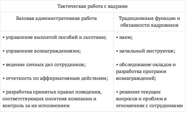Р. Кристенсен10 определяет различия между тактической и стратегической работой с кадрами следующим образом: к тактическим задачам относится стандартная кадровая работа, необходимая для ежедневного выполнения работниками своих функций (табл. 2).