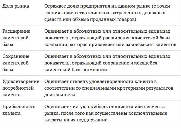 Клиенты рассматриваются с точки зрения имеющейся доли рынка, размера клиентской базы, лояльности потребителей, а также их удовлетворенности и возможности предвосхитить их ожидания (табл. 7).