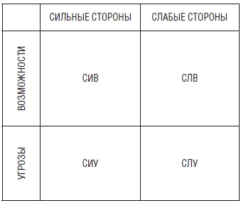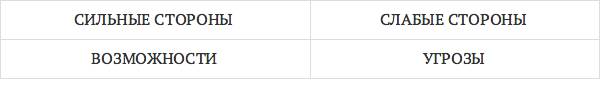 SWOT-анализ представляет собой анализ организации по четырем критериям, два из которых относятся к внутренней среде (сильные и слабые стороны), и два – к внешней (возможности и угрозы). Метод назван по первым буквам английских наименований критериев: Strengths (сильные стороны), Weaknesses (слабые стороны), Opportunities (возможности) и Threats (угрозы). Анализ включает в себя построение матрицы из четырех квадрантов, включающих указанные критерии (табл. 8).