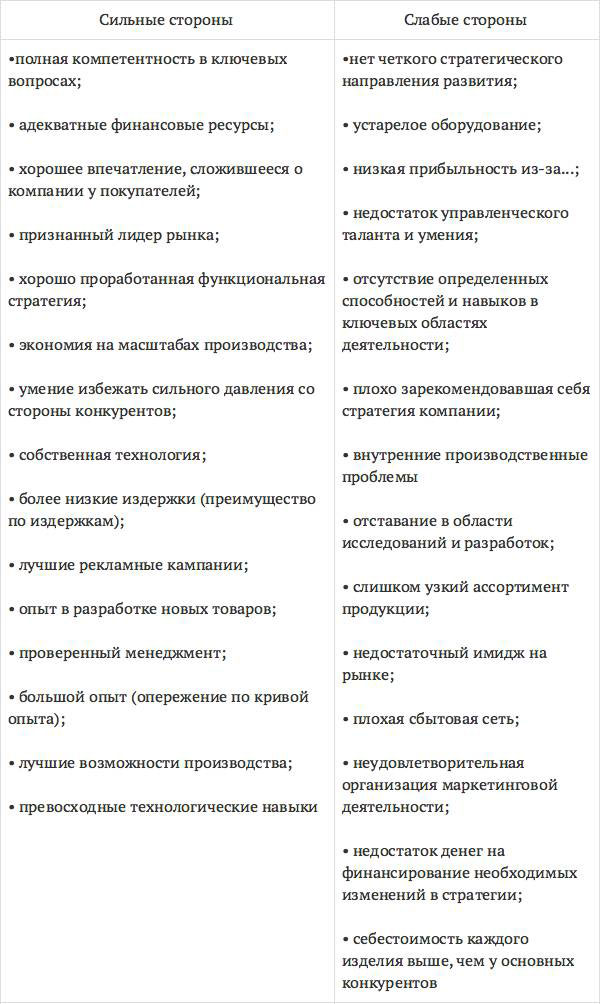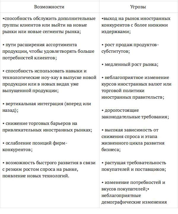 Анализ внешней среды позволяет организации определить основные возможности и угрозы, составить прогноз возможного развития событий. Однако подобные исследования не могут осуществляться без одновременного анализа внутренней среды организации, ее сильных и слабых сторон.