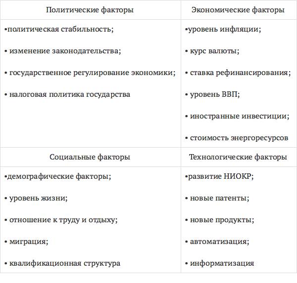 PEST (или STEP) анализ позволяет определить влияние макросреды на деятельность организации. Название метода является аббревиатурой (political, economic, social, technological) слов, составляющих объект анализа – политические, экономические, социальные и технологические факторы внешней среды (табл. 3). PEST-анализ широко применяется в маркетинге для прогнозирования будущего компании.