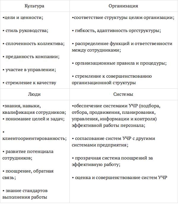 Люди в организации являются основным фактором внутренней среды, который больше остальных нуждается в регулярном мониторинге. В конечном итоге цели, задачи, технологии – результат деятельности персонала, от него в большей мере зависит возможность реализации стратегии на уровне организации. Для обеспечения непрерывного анализа состояния человеческих ресурсов в организации используется методика COPS (culture, organization, people, system). Она позволяет оценить четыре основных фактора, влияющих на эффективность управления человеческими ресурсами (табл. 4).