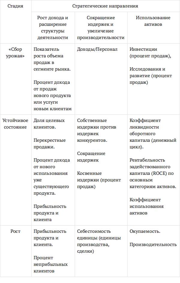 Финансы – необходимый критерий оценки эффективности компании с точки зрения ее акционеров. Д. Нортон и Р. Каплан16 отмечают, что финансовые показатели дают представление о прошлом и без связи с другими показателями не способны отразить реальное положение дел в компании для выработки долгосрочной стратегии развития. Тем не менее финансовая составляющая является обязательной в сбалансированной системе показателей. Авторы выделяют определенные показатели финансовой составляющей в зависимости от стадии развития организации (табл. 5).
