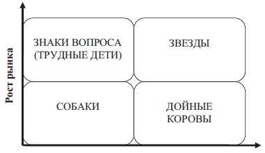 В основе матрицы лежит оценка бизнес-единиц по двум критериям: доля рынка и рост рынка, которая позволяет выделить четыре типа подразделений диверсифицированной корпорации.