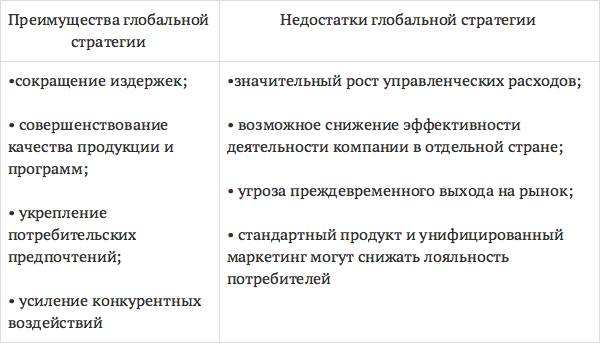 Отдельно выделяют так называемую глобальную стратегию, т. е. стратегию, выходящую за рамки национального рынка. Глобальная стратегия также имеет ряд преимуществ и недостатков (табл. 10)28.